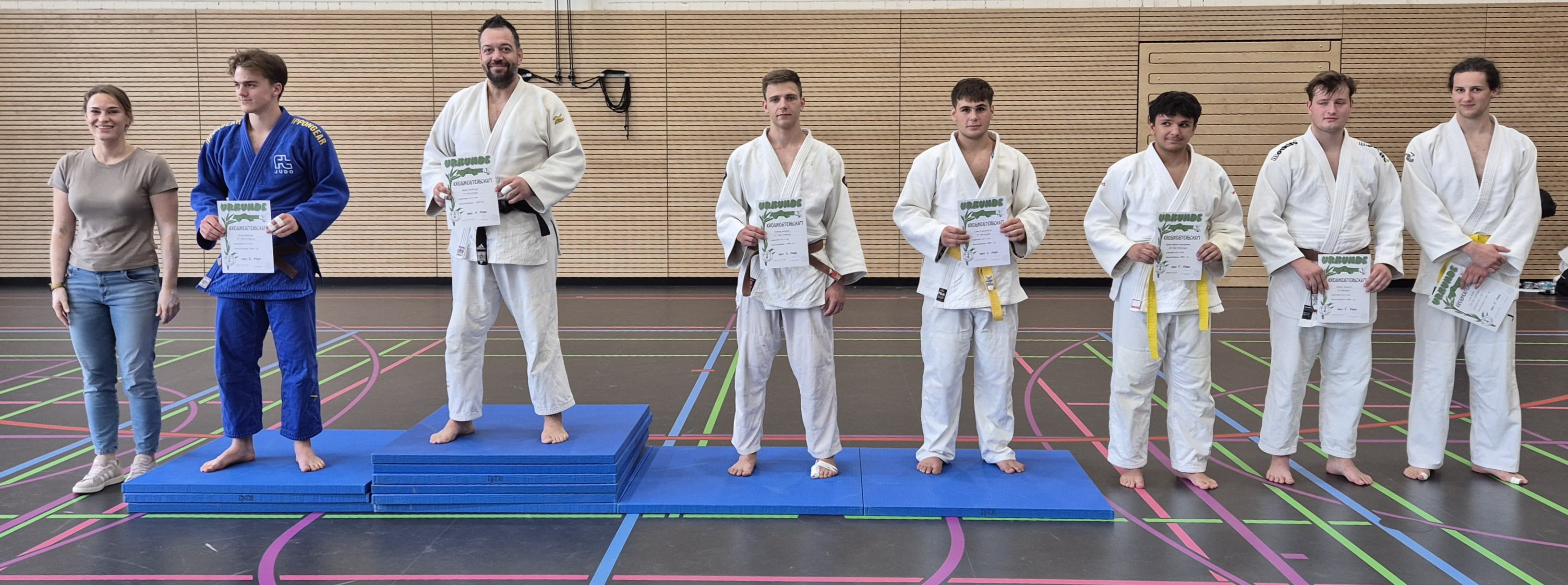 Kreismeister Martin Röttinger auf dem Siegerpodest; links im Bild die Vizepräsidentin des Badischen Judo-Verbandes; vierter Judoka (von rechts): Leon Katschatrian.