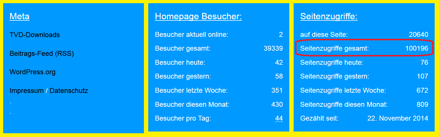 So still und heimlich haben wir die 100.000 Seitenzugriffe auf www.tvdenzlingen.de/wp überschritten, seit die Homepage vor knapp 5 Jahren auf ein modernes CSS (mit WordPress) aktualisiert wurde.