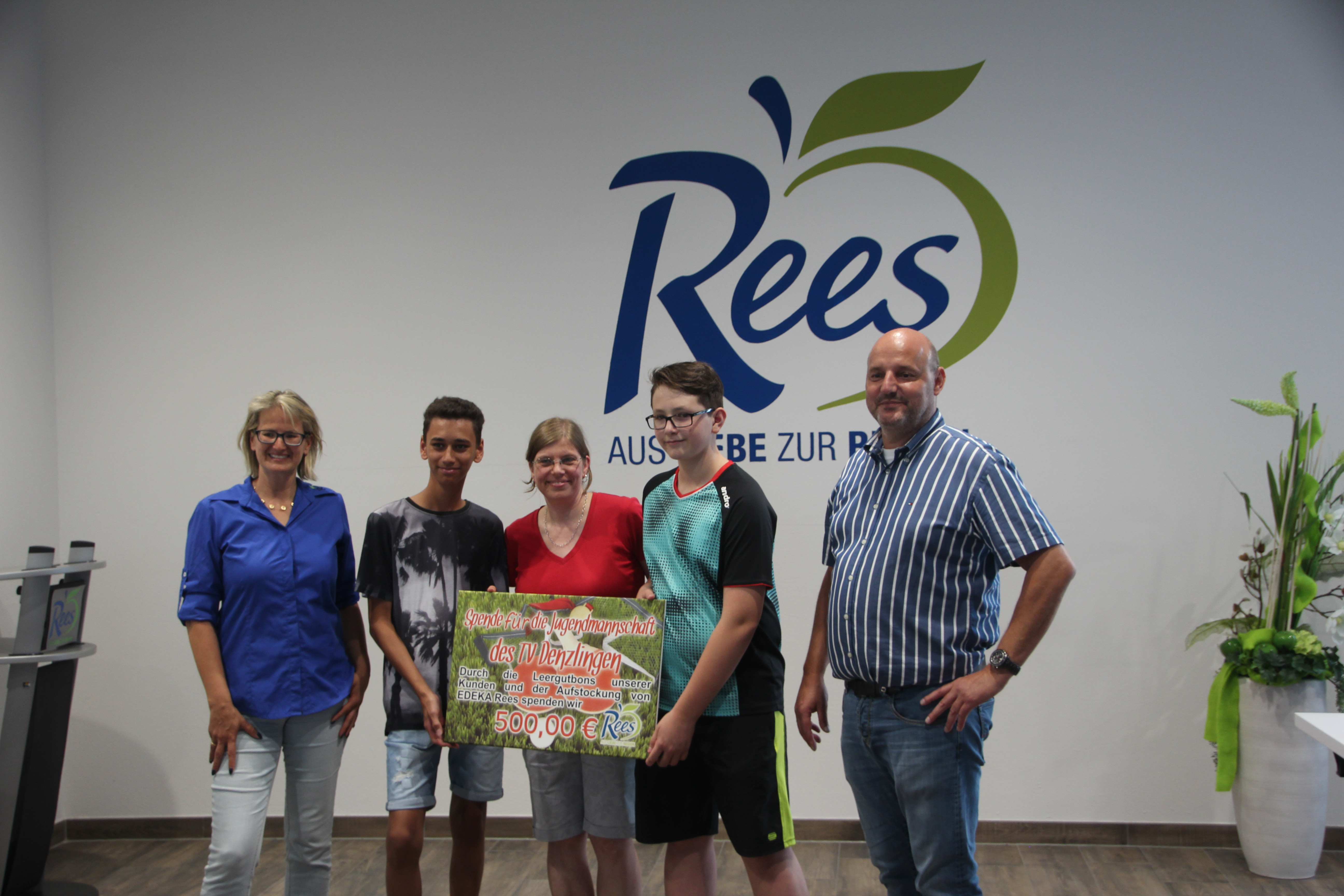 Tischtennis: Lebensmittelmärkte Rees unterstützen Vereine in der Region – Pfandspenden von Kunden und eine Aufstockung der EDEKA-Märkte Rees erbrachten 9000€ und helfen damit acht sozialen Einrichtungen und Vereinen der Region. Darunter mit 500€ auch die Denzlinger Tischtennis Jugendabteilung.