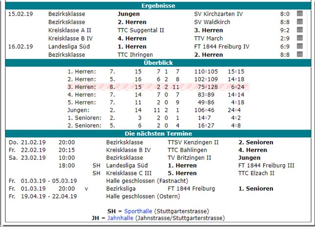 Nächsten Freitag treten wir beim Tabellenzweiten in Bahlingen an. Da der Klassenerhalt seit letzter Woche feststeht, werden wir dort befreit aufspielen können. Wenn die Aufstellung stimmt, wollen wir auch da in jedem Spiel selbstbewusst antreten.