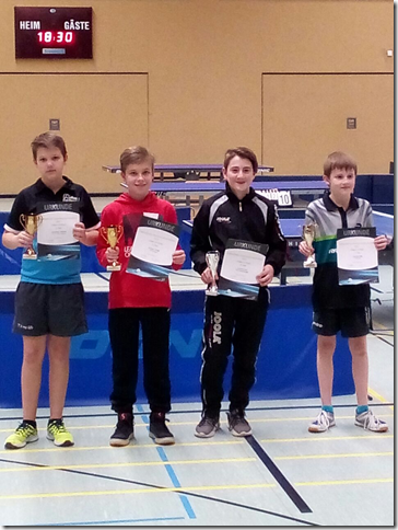Der U13-Wettbewerb der Jungs wurde im Einzel dominiert von Hendrik Bär (TTG Ulm), der bereits am Vortag im U15-Wettbewerb im Halbfinale war. Im Finale setzte er sich gegen den etwas überraschenden Finalisten Lennox Day durch. Auf den dritten Plätzen landeten Jonathan Häckel (FT 1844 Freiburg) und Philipp Weigl (TTC Singen). Im Doppelwettbewerb zeigten Florian Streifeneder und Niklas Kern (beide TTC Suggental) was es bedeutet eingespielt zu sein. Sie konnten sich im Finale mit 3:0 gegen Lennox Day und Philipp Weigl durchsetzen.
