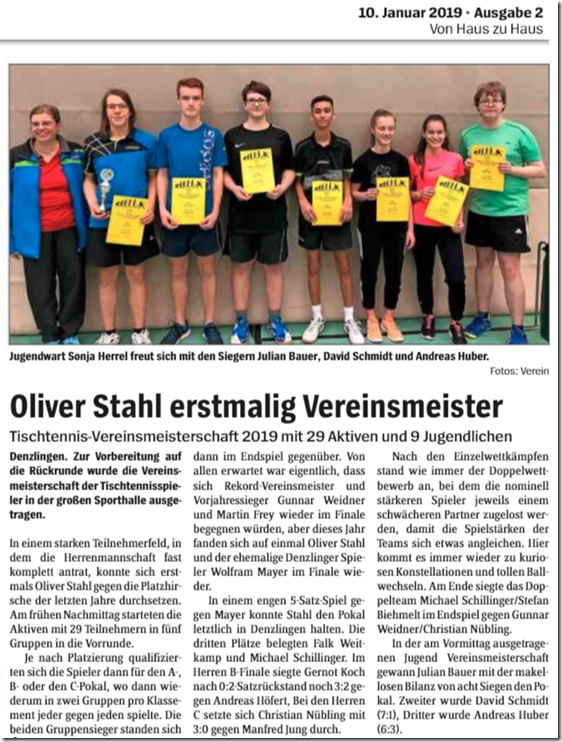 Tischtennis: Zur Vorbereitung auf die Rückrunde wurde am Samstag 5. Januar traditionell die Vereinsmeisterschaft der Denzlinger Tischtennisspieler in der großen Sporthalle ausgetragen.