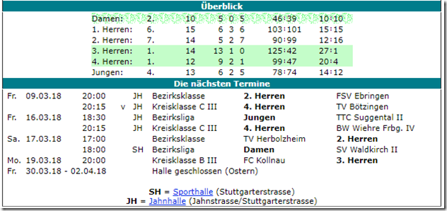 In der C-Klasse hat sich die Vierte nominell einen der zwei Aufstiegsplätze schon gesichert aufgrund des deutlich besseren Spielverhältnisses gegenüber Bleichheim. Am Freitag 9.3. kommt es im Heimspiel gegen den Tabellenzweiten TV Bötzingen möglicherweise zur Vorentscheidung um die Meisterschaft.